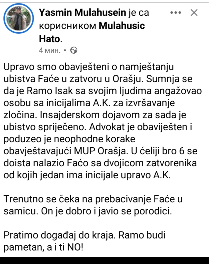 Upravo smo obavješteni o namještanju ubistva Faće u zatvoru u Orašju.
